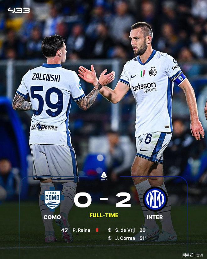 国米客场2-0击败科莫,81分以1分之差屈居亚军。恰尔汗奥卢角球助攻德弗里破门,雷纳飞铲染红,科雷亚再下一城。